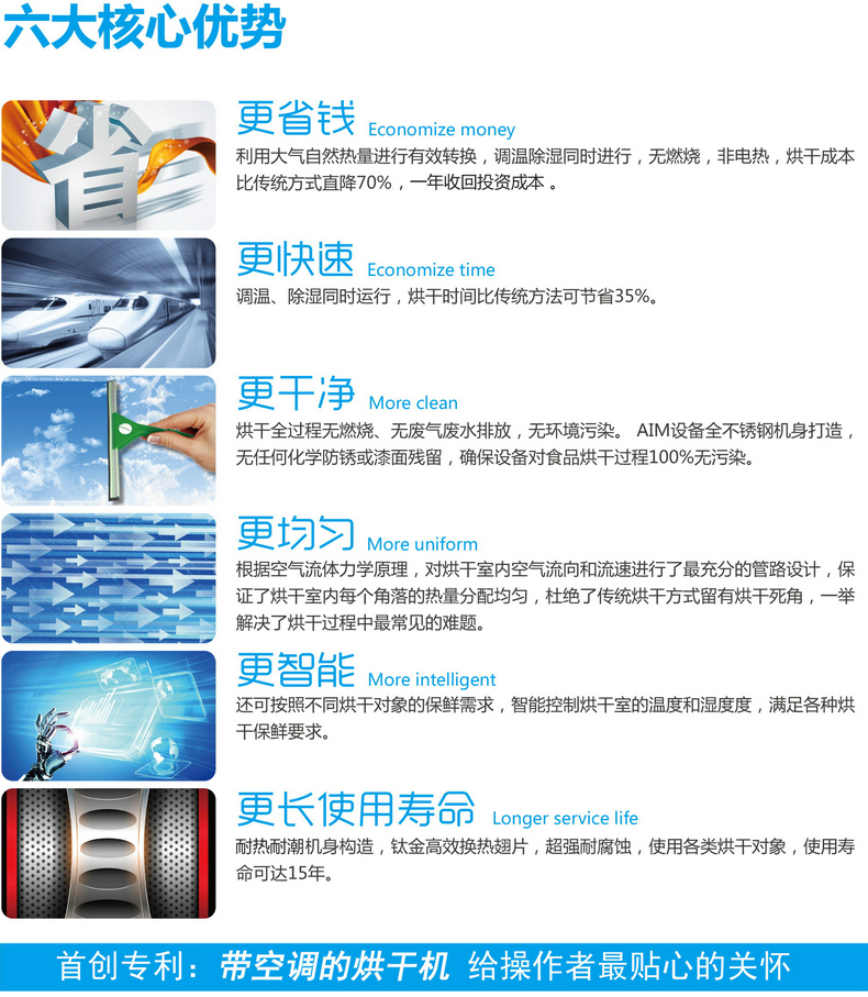 空气能热泵一体式/整体式烘干机是集热源、干燥、余热回收、除湿于一体的半闭式烘干设备,该设备与烘房形成一个闭式循环系统,回风做除湿处理,余热进行回收,每次进入烘房内的热风均为干燥风,避免循环湿气对物料造成回潮影响。改机组设计为智能控制,能实现对温度、湿度、风量、时间的控制,对于不同物料可设定不同烘干模式,具有干燥速度快、产量大、运行成本低等优点。