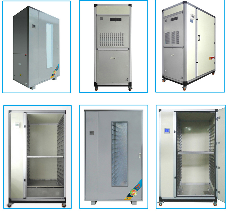 空气能烘干机是一种应用闭式热泵装置的箱体干燥机,近年来应用于香菇、木耳等食用菌的干燥加工及实验,本机结构简单,热泵装置安装在箱体的一侧,除去必要的风道,余下的地方用来安放分层托盘,待干燥的物料,均匀的摊放在托盘上。